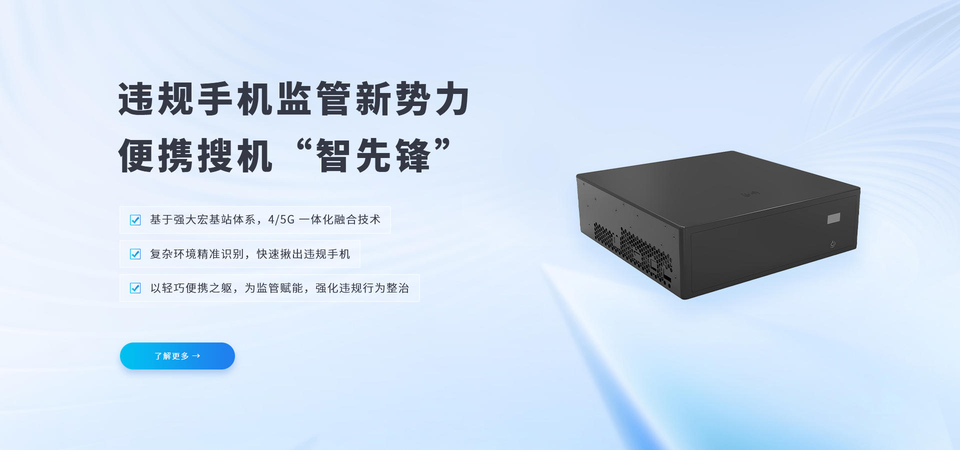 采用一體化機身設計,通過該設備可對周邊手機進行智能識別,并進一步搜尋違規手機信號源位置。